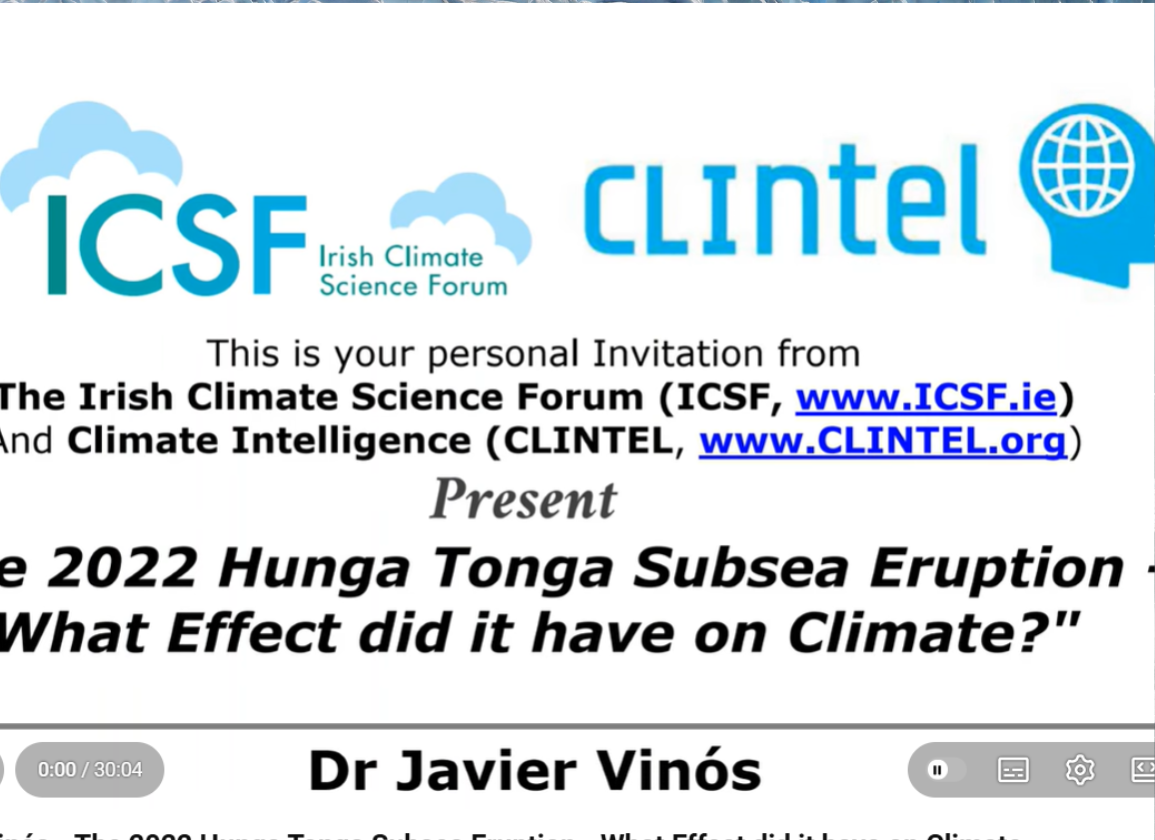 Tijdens een recente ICSF/Clintel-lezing stelde dr. Javier Vinós dat de uitbarsting van Hunga Tonga (15 januari 2022) de belangrijkste oorzaak was van de uitzonderlijke mondiale klimaatafwijkingen in 2023-2024. Volgens hem betreft het de eerste meerjarige wereldwijde klimaatgebeurtenis in circa 80 jaar, waarvan de oorzaken verkeerd worden geduid.