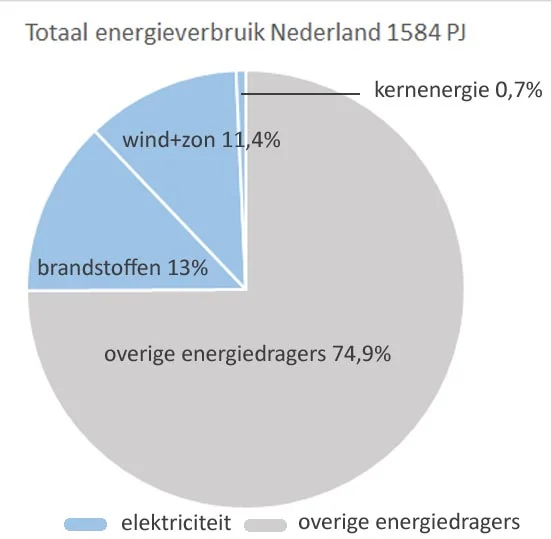 Ik heb in figuur 2 het deel dat gebruikt wordt als elektriciteit blauw gekleurd. Ongeveer ¼ van alle energie die we gebruiken is dus in de vorm van elektriciteit. Wind, zon en kernenergie worden vrijwel uitsluitend gebruikt voor het opwekken van elektriciteit. De percentuele verdeling ten opzichte van het totale energieverbruik is in de grafiek weergegeven. De grijze rest van de grafiek (overige energiedragers) zijn met name steenkool, bruinkool en kolenproducten, aardolie en olieproducten en aardgas. Voorbeelden van die laatste groep zijn benzine en dieselolie, kerosine, cokes voor de staalindustrie, aardgas voor verwarming en koken, et cetera. Dat deel (overige energiedragers) vormt ¾ van alle energie die we gebruiken. Samen met de 13% brandstoffen voor elektriciteitsproductie betekent dit dat momenteel 88% van ons energieverbruik op gaat aan brandstoffen! Terwijl de halve Noordzee vol staat met windmolens en overal zonnepanelen te zien zijn.