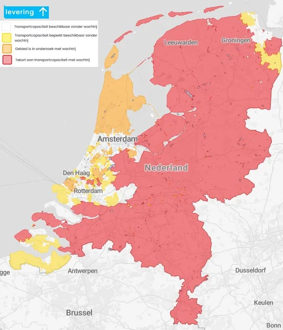 Figuur 3 is de capaciteitskaart voor wat betreft de levering van elektriciteit aan het net. Deze kaart is bedoeld voor partijen die plannen maken voor grootschalige projecten (netaansluiting groter dan 3x80A) die energie leveren aan het elektriciteitsnet, zoals zonne- en windparken. Daarbij horen ook de windparken op zee. De kaart laat zien dat uitbreiding van het deel wind + zon in het lichtblauwe elektriciteitsdeel van figuur 2 feitelijk onmogelijk is: het net is (over-)vol.