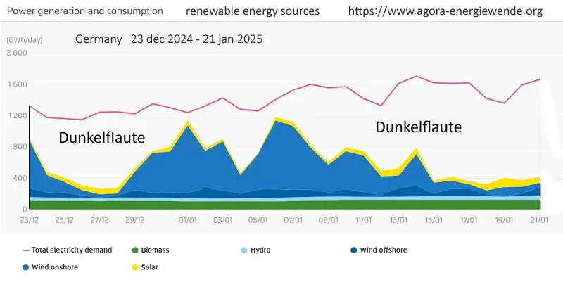 Onlangs schreef ik al voor de tweede maal over de ‘Dunkelflaute’ die een deel van West Europa een aantal weken in zijn greep had. Omdat wind- en zonne-energie onregelmatig beschikbaar zijn is het nodig om een vrijwel volledig backup netwerk van conventionele centrales te hebben die in tijden van Dunkelflaute zorgen voor een stabiel netwerk. Dat geldt niet alleen voor periodes van weken, maar ook een enkele nacht met weinig wind maakt een dergelijke backup noodzakelijk. De meest recente Dunkelflaute met negatieve elektriciteitsprijzen maakten we deze week mee: