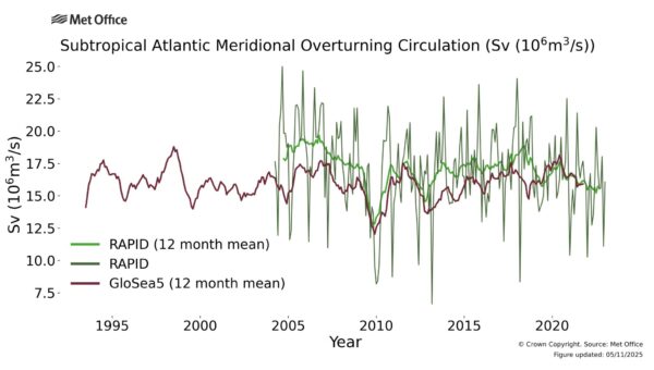 Een recente publicatie van Terhaar et al (2025) in Nature Communications concludeerde: “Based on the here identified relationship and observation-based estimates of the past air-sea heat flux in the North Atlantic from reanalysis products, the decadal averaged AMOC at 26.5°N has not weakened from 1963 to 2017 although substantial variability exists at all latitudes.”