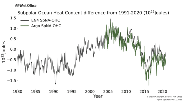 Figuur 4 toont de anomalie van de warmte-inhoud van de subpolaire Noord-Atlantische Oceaan (SpNA-OHC) tot een diepte van 1000 m, uitgedrukt als verschil ten opzichte van het gemiddelde over 1991–2020. De data zijn afkomstig van EN4 (vanaf 1980) en Argo boeien (vanaf 2004) op een breedte van 45°-67° NB. Ook hier is van een neerwaartse langjarige trend geen sprake.
