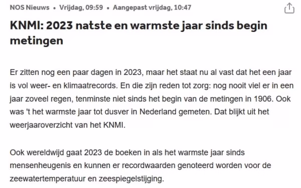 En dan die laatste alinea uit het NOS bericht van figuur 1: “Ook wereldwijd gaat 2023 de boeken in als het warmste jaar sinds mensenheugenis en kunnen er recordwaarden genoteerd worden voor de zeewatertemperatuur en zeespiegelstijging.” Dat ‘sinds mensenheugenis’ tekent wel de gretigheid waarmee de NOS elk weer- en klimaatbericht een alarmistisch jasje aantrekt. En die ‘recordwaarden’ voor de zee-temperatuur en zeespiegelstijging wil ik nog wel eens waargemaakt zien, ik geloof er niks van.
