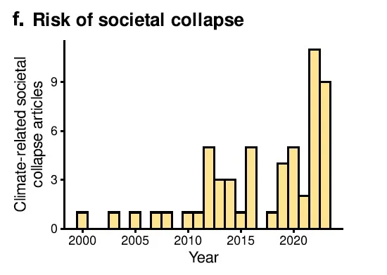 De belangrijkste boodschap van deze Staat van het Klimaat is dat we momenteel een nieuw tijdperk betreden van onvoorspelbare, volkomen uit de hand lopende klimaatverandering, met een grote kans op de totale ineenstorting van de menselijke maatschappij op aarde. Wat is daarvoor hun onderbouwing? Onderstaande grafiek, die de groei van het aantal artikelen over zo’n totale ineenstorting laat zien: