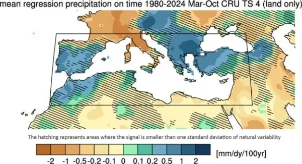 Van de 5 genoemde landen in het Middellands Zeegebied laten Portugal, Spanje en Griekenland een toename zien van de neerslag tussen maart en oktober, alleen Frankrijk en Italië laten een afname zien.