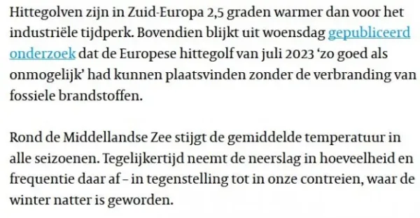 De link naar dat onderzoek waaruit zou blijken dat ‘de Europese hittegolf van 2023 zo goed als onmogelijk had kunnen plaatsvinden zonder de verbranding van fossiele brandstoffen’ werkt niet meer. De pagina van de World Weather Attribution organisatie is blanco. Weggehaald. Ik vermoed sterk omdat de claim met die fossiele brandstoffen niet waar te maken was. Ook de opmerking van Van der Wiel dat de neerslag afneemt in hoeveelheid is onjuist, zoals ik hierboven heb laten zien.