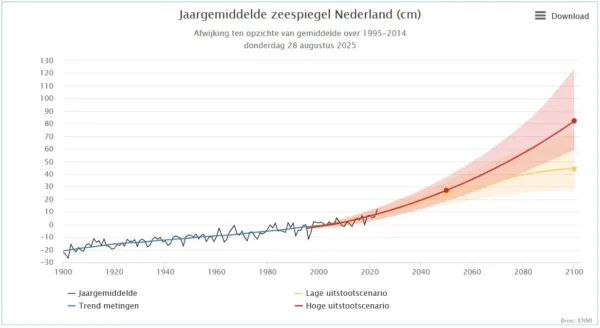 Op basis daarvan werden zeespiegelmodellen ontwikkeld die voor 2100 vrij extreme zeespiegelhoogten voorspelden. Figuur 2 is de prognose van het KNMI voor de zeespiegelhoogten aan de Nederlandse kust tot 2100. Die kan volgens het KNMI in 2100 oplopen tot meer dan 120 cm. In een artikel uit 2024 heb ik voor de vijf Nederlandse kuststations berekend dat van 1900-2022 de relatieve zeespiegelstijging 1,92 mm/jaar was. Trek je daar de gemiddelde bodemdaling langs de kust van af, dan kom je op een absolute zeespiegelstijging aan de Nederlandse kust van 1,45 mm/jaar.