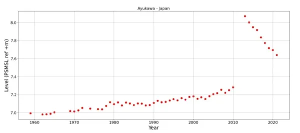 Negen stations vertoonden echter wel een versnelling van de zeespiegel. Deze stations liggen meestal in de buurt van stations die géén versnelling van de zeespiegelstijging laten zien en het is daarom onwaarschijnlijk dat een wereldwijd fenomeen als de opwarming van de aarde als gevolg van CO2 eraan ten grondslag ligt. We onderzochten elk van deze 9 stations en ontdekten dat vrijwel altijd recente lokale factoren, zoals aardbevingen (Japan), verzakkingen door grondwateronttrekking of massale bebouwing (zoals in Bangkok of Mumbai) bij de versnelling een rol spelen. Figuur 9 toont de extreme verandering van de zeespiegel op het Japanse station Ayukawa, het gevolg van de zware Tohoku zeebeving in 2011. Na de verwoestende tsunami die daarvan het gevolg was stond het zeeniveau bij het Japanse station 80 cm hoger dan voordien. Sinds 2011 daalt het zeeniveau in Ayukawa in plaats van dat het stijgt (zoals dat tot 2011 het geval was).
