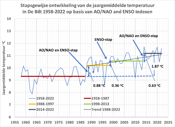 De jaargemiddelde-temperatuur in De Bilt van 1958 t/m 2022 is weergegeven in figuur 1. Het verloop laat zien dat de temperatuur tot 1988 geen trend vertoont, maar daarna t/m 2022 is gestegen met 1,8-1,9 oC door veranderingen in de herkomst van luchtmassa’s en positieve ENSO-indexen (El Niño’s). De grootste sprong is opgetreden in de winter/lente-periode van 1988. Deze is vooral veroorzaakt door een plotselinge omkering van de Arctische en Noord-Atlantische Oscillatie indexen (AO/NAO) van negatief naar positief (figuur 2); een positieve index duidt op bovengemiddeld hoge luchtdruk in het zuiden en lage luchtdruk in het noorden van de Noord-Atlantische Oceaan, wat, onder invloed van de aardrotatie, een zuidwestelijke luchtstroom genereert. Hierdoor worden rond de winterperiode zachte oceanische luchtmassa’s aangevoerd. Gewoonlijk wordt de stijging van het temperatuursverloop benaderd door een (lineaire) trend met verwijzing naar de toename van de CO2-concentratie, maar op basis van de oorzaken van de stijging (El Niño’s en veranderingen in de AO/NAO-index) is de ontwikkeling stapsgewijs geweest. Dat wordt bevestigd door analyse van gesommeerde afwijkingen van het gemiddelde1.