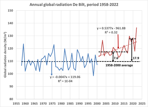 Uit figuur 2 valt ook af te leiden dat 1988 een gamechanger is geweest met een toename van de aanvoer van oceanische lucht (3) vanaf dat jaar. De temperatuursprongen bij de ENSO-stappen in de laatste decennia, duiden op een opwarming van de oceanen, omdat de ENSO zonder opwarming in beginsel klimaatneutraal is. Deze opwarming kan verklaard worden uit een wereldwijde toename van de globale straling, die ook duidelijk in metingen van De Bilt is te zien.