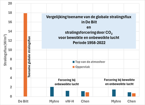 De CO2-forcering in W/m2 verloopt evenredig met de logaritme van de concentratie-verhouding. Het IPCC hanteert hiervoor bij TOA (de top van de atmosfeer) voor een verdubbeling van CO2 de waarden van Myhre e.a. (4), respectievelijk 5,0 en 3,7 W/m2 voor onbewolkte en bewolkte lucht. Deze resultaten zijn gebaseerd op modelresultaten van pre-industriële condities tot die van midden jaren negentig. Echter, Van Wijngaarden en Happer (2019/2022)(5) vinden op basis van stralingsfysica voor een recente wolkenvrije atmosfeer een forcering die ~40% lager ligt (3,0 W/m2 met een temperatuureffect van 0,8 oC). De modelresultaten van Chen e.a.(6), gebaseerd op atmosferische omstandigheden van de laatste twee decennia, bevestigen dit. Deze studie geeft voorts de forceringen voor een verdubbeling van CO2, aan het oppervlak (SFC). De evenredigheids-coëfficiënten uit voorgaande studieresultaten, toegepast op de periode 1958-2022, geven de in figuur 5 gepresenteerde forceringen aan TOA en SFC. Deze worden vergeleken met de toename van de globale straling in die periode. De laatste is een orde groter dan de forceringen! Broeikasgas-emissies dragen dus slechts in geringe mate bij aan de opwarming; een schonere lucht met minder aerosolen en wolken des te meer.