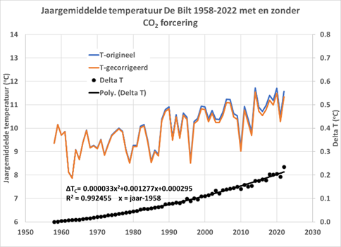 De belangrijkste absorptieband van CO2 ligt rond de 15 μm, en zorgt bij toenemende concentratie aan het oppervlak voor een vergroting van de atmosferische tegenstraling. Met de FAO/ASCE-methode voor de bepaling van atmosferische tegenstraling met bewolkingscorrecties volgens Shuttleworth en Unsworth-Monteith(1) en de waargenomen relaties tussen de temperatuur, dampspanningen en relatieve zonneschijn-duur, is het effect van de forcering volgens Chen uit figuur 5 vertaald naar de impact op de jaargemiddelde-temperatuur. Afhankelijk van de bewolkingscorrectie wordt tot 2023 een stijging van 0,20-0,22 oC gevonden (figuur 6); d.w.z. een magere 11-12% van de waargenomen stijging in De Bilt.
