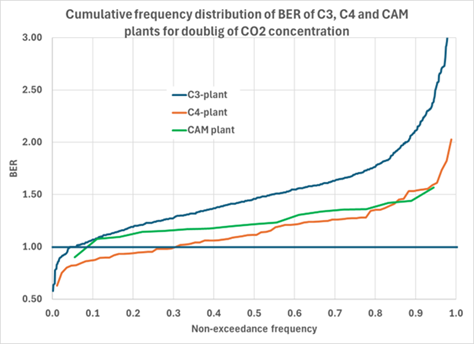 Figuur 7 Effect van 2xCO2 op toename van de biomassa bij C3, C4 en CAM planten