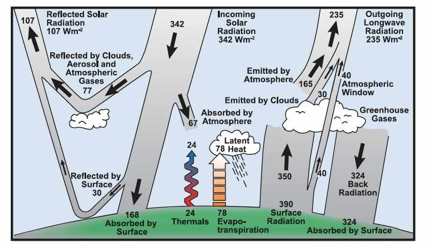 1. Broeikasgassen geven meer straling af dan ze absorberen en hebben de neiging om de atmosfeer af te koelen. De mondiale en jaarlijkse gemiddelde energiebalans van de aarde is afkomstig uit een IPCC-rapport en is gebaseerd op het werk van Kiehl en Trenberth. De broeikasgassen, wolken en aerosolen stralen 195 W/m2 uit naar de ruimte en 324 W/m2 terug naar het aardoppervlak (totale emissie 519 W/m2). De broeikasgassen, wolken en aerosolen absorberen 350 W/m2 die door het aardoppervlak wordt uitgestraald en 67 W/m2 aan zonnestraling (totale absorptie 417 W/m2). Dat wil zeggen dat het verlies aan stralingsenergie met een snelheid van 102 W/m2 de atmosfeer afkoelt. Het stralingsverlies wordt gecompenseerd door een warmtestroom (24 W/m2) en latente verdampingsenergie (78 W/m2) van het aardoppervlak naar de atmosfeer.