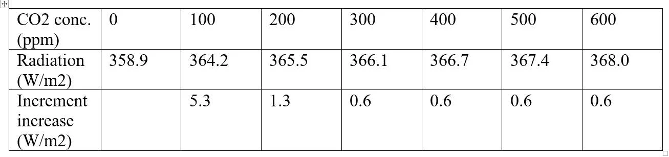 6. Koolstofdioxide heeft weinig invloed op de temperatuur aan het aardoppervlak. De temperatuur aan het aardoppervlak is hoger omdat de straling van broeikasgassen, wolken en aerosolen die het oppervlak bereiken, het netto verlies aan langegolf-straling vanaf het oppervlak vermindert. Een hogere koolstofdioxide-concentratie in de atmosfeer heeft weinig invloed op de temperatuur aan het oppervlak, omdat er weinig verandering optreedt in de langegolf-straling die het tropische oppervlak bereikt naarmate de koolstofdioxide-concentratie toeneemt. De onderstaande berekeningen zijn gemaakt met behulp van het MODTRAN-stralingsoverdrachtsmodel en hebben betrekking op de tropische atmosfeer zonder wolken en met een constante temperatuur. Sinds de industrialisatie bedroeg de toename van de door broeikasgassen uitgezonden straling die het aardoppervlak bereikt ongeveer 0,6 W/m2 voor elke toename van 100 ppm in de kooldioxideconcentratie. Dat is een toename van 0,3 procent van de door waterdamp uitgezonden straling. Merk op dat vanaf het laatste glaciale maximum 20.000 jaar geleden tot aan het pre-industriële tijdperk, de kooldioxideconcentratie is gestegen van bijna 200 ppm tot bijna 300 ppm (een stijging van slechts 100 ppm). Tijdens deze periode smolten de poolkappen die een groot deel van Noord-Amerika en Noord-Europa bedekten en steeg de zeespiegel met ongeveer 130 meter. Sinds de industrialisatie is de kooldioxide met meer dan 100 ppm toegenomen, maar de zeespiegelstijging is onbeduidend geweest. Dit wijst er niet op dat de kooldioxide-concentratie van invloed is op de verandering van het klimaat op aarde.