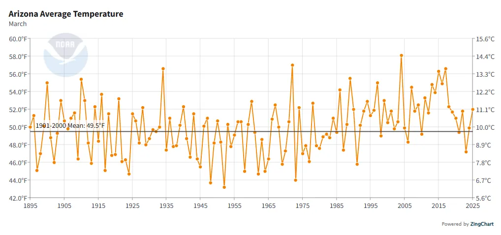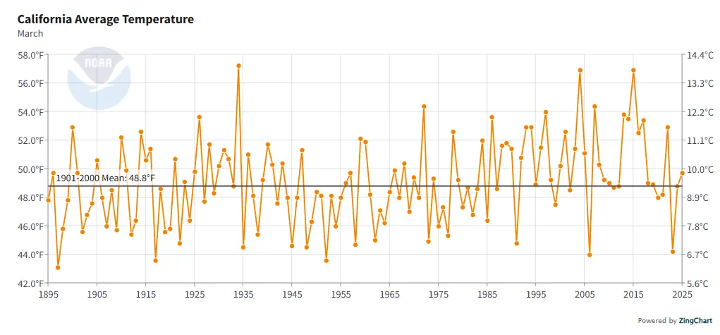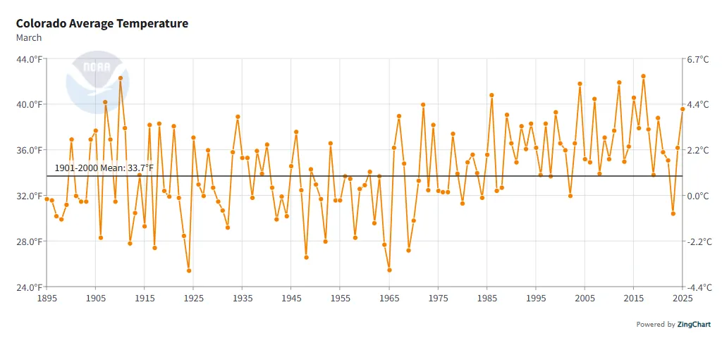 In Colorado laten de temperatuurreeksen voor maart grote schommelingen zien, met warme periodes in het begin van de twintigste eeuw die vergelijkbaar zijn met — of zelfs hoger liggen dan — recente waarden.