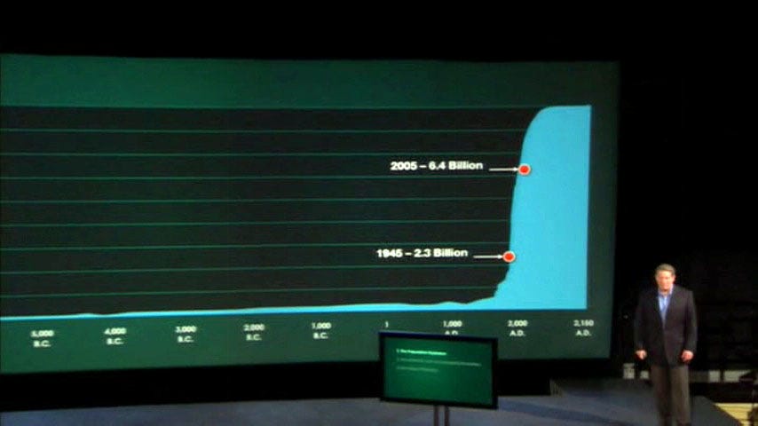 Al Gore houdt zijn beroemde diavoorstelling rond 2006. Hier toont hij een grafiek van de wereldbevolking.