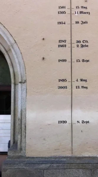 De foto hierboven is van het oude Rathaus in Passau, de stad die op de plaats ligt waar de Donau Duitsland verlaat. Op de muur zijn de waterhoogten van gedenkwaardige overstromingen door de Donau weergegeven vanaf de 16e eeuw. De Donau is een regenrivier die in het Zwarte Woud ontspringt en waarop een groot deel van Zuid-Duitsland afwatert. Opvallend is dat de meeste overstromingen in de zomer plaatsvonden, dus als gevolg van zware of langdurige regens. Van de meeste van deze overstromingen zijn geen neerslagdata beschikbaar, maar de streepjes en jaartallen spreken boekdelen.