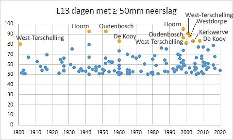 Figuur 2 heb ik in een vorig bericht gebruikt en laat de hoeveelheid dagen en etmaalsommen zien sinds 1901 van de 13 neerslagstations die de L13 reeks genoemd worden. Te zien is dat vooral tussen 1990 en 2010 het aantal dagen met zware neerslag (≥ 50mm) toegenomen is. De dagen met extreme neerslag (≥ 80mm) zijn geel/beige gekleurd. Opvallend is dat die extreme neerslag in een strook direct achter de kustlijn gevallen is. Dergelijke zware neerslag valt vooral in de zomer, zoals figuur 3 laat zien: