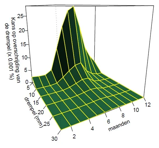 Dat zware neerslag in de zomer niet uitzonderlijk is maar eerder regel laat figuur 3 zien. Het diagram toont dat de neerslag boven een bepaalde drempel een piek heeft in de zomermaanden, maar dat de kans daarop bij zware neerslag veel lager is dan bij minder zware neerslag. De neerslaghoeveelheden zoals die in oostelijk Zuid-Limburg gemeten werden zijn dus erg uitzonderlijk. Maar hoe uitzonderlijk ook, er moet een verklaring voor te bedenken zijn.