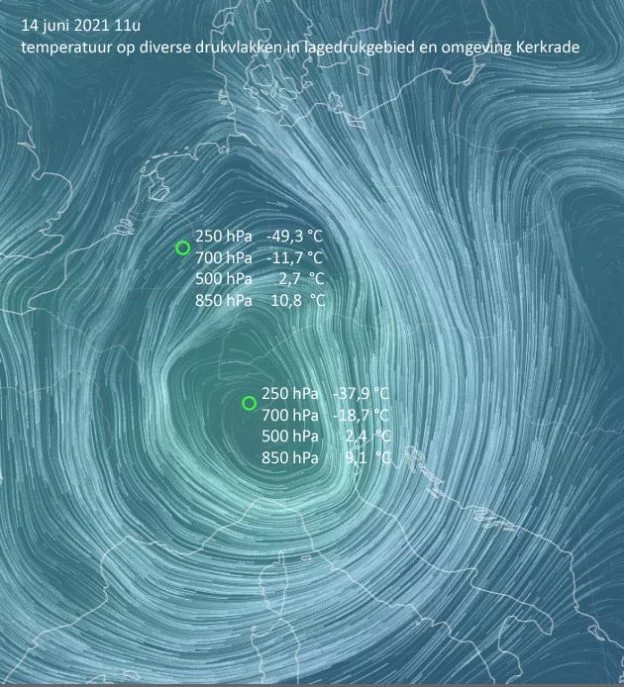 Wat wel toepasbaar is op de lokale situatie rond 14 juli in oostelijk Zuid-Limburg, Ardennen en Eifel is de aanwezigheid van een zogenaamde ‘koudeput’ die zich ten tijde van de extreme neerslag in de omgeving bevond. Een koudeput is het zomerse broertje van ‘polar lows’, een lagedrukgebied waar zich in de bovenlucht een koude luchtbel bevindt. Een koudeput wordt, anders dan bij ‘normale’ lagedrukgebieden in de gematigde zone, niet vergezeld van een frontensysteem.