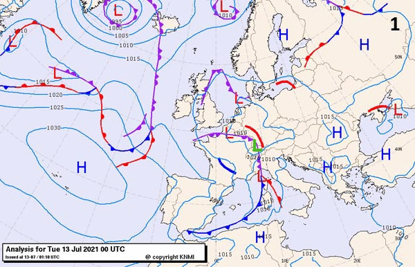 In de animatie van figuur 5 zijn voor de dagen 13 t/m 15 juli de op de site van het KNMI beschikbare weerkaarten (4 per etmaal) achter elkaar geplaatst. Duidelijk is te zien dat de koudeput (de groene L) enkele dagen, tot in de middag op 15 juli, een rondje draait en nauwelijks van zijn plaats komt. Dat is kenmerkend voor een koudeput. Wat ook kenmerkend is, is dat het lagedrukgebied dan plots weer verdwijnt. De ‘motor’ van het systeem, de koude bel in de bovenlucht, wordt dan opgevuld met warmere lucht. Dat is te zien op het laatste plaatje van de animatie.