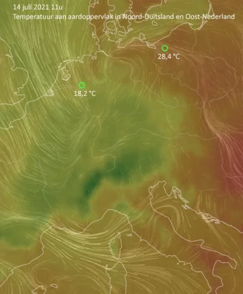 Figuur 6 toont de situatie aan het aardoppervlak op 14 juli om 11u. De dunne lijntjes geven de stroming weer. Let op het verschil in temperatuur tussen de oostelijke stroming in Noord-Duitsland en de noordelijke stroming in Oost-Nederland. Op Buienradar leverde dat dit plaatje op, met de convergentiezone boven Oost-Nederland waar door het ‘optillen’ van de warme lucht pittige buien aan het ontstaan zijn: