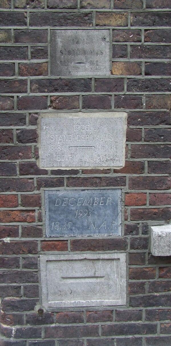 Figuur 9 laat de gedenkstenen van hoge waterstanden zien van de Maas in Venlo. De bovenste steen geeft voor het jaar 1643 een waterhoogte van 19m33 boven AP weer. Daaronder de stenen van 1926 en 1993. In dat laatste jaar was de waterhoogte ongeveer een meter lager dan in 1643. De waterafvoer in 1643 wordt geschat op 3.600 m³/s. De maximum afvoer op 17 juli 2021 bij Venlo was 2927 m3/sec (bron Rijkswaterstaat).
