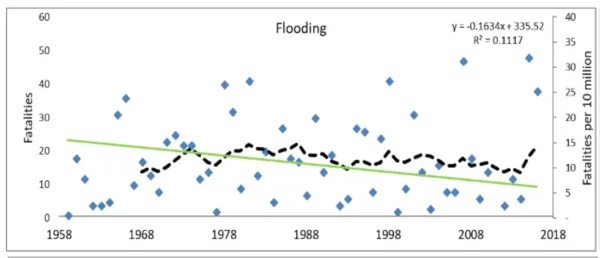 groene lijn = lineaire trend van dodelijke overstromingen genormaliseerd naar bevolking. Bron: Paul et al. 2018.