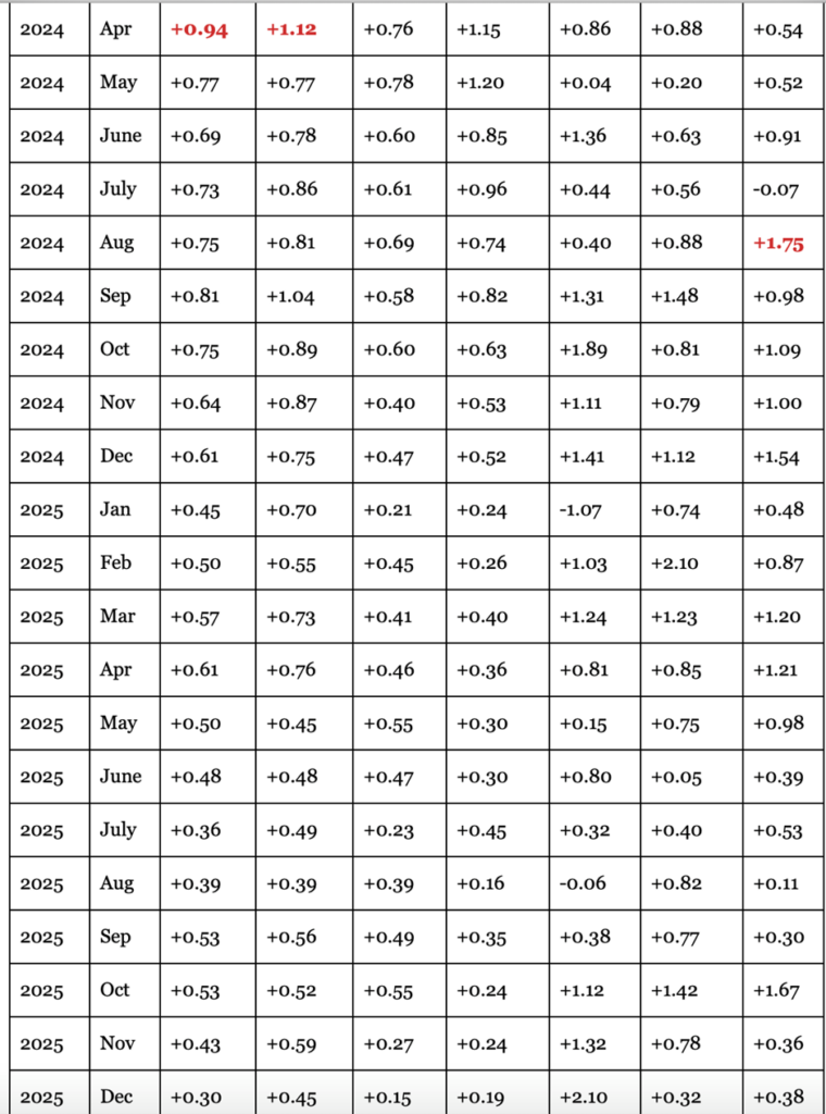 Figuur 1: De nauwkeurige UAH-satellietreeks laat de scherpe daling duidelijk zien, waarbij het verschil — of de anomalie — ten opzichte van het gemiddelde over 1991–2020 in de loop van 2025 afneemt en het jaar eindigt op slechts 0,3°C.