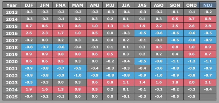Figuur 2: Langs de evenaar in de Stille Oceaan dalen de zeeoppervlaktetemperaturen (SST’s) al maanden. In zijn recente rapport over de vorming van El Niño- (opwarming) en La Niña-oscillaties (afkoeling) presenteert de Amerikaanse weerdienst NOAA de meest recente driemaandelijkse voortschrijdende anomalieën. Sinds afgelopen september, zo merkt NOAA op, “blijven de SST’s onder het gemiddelde in het grootste deel van de equatoriale Stille Oceaan”.