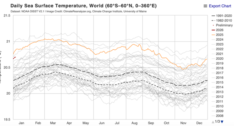 Opnieuw lijkt het erop dat de temperaturen aan het dalen zijn, waarbij 2026 koeler begint dan 2025, en 2025 koeler was dan 2024.