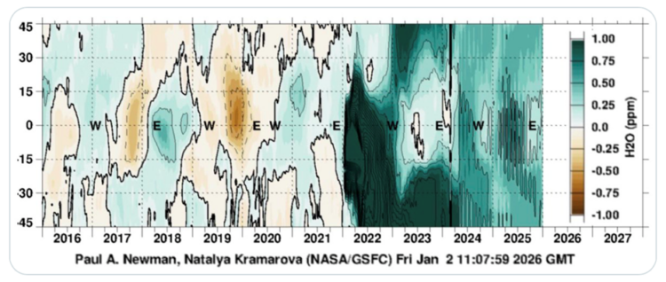 De enorme toename van waterdamp in de stratosfeer is te zien in de meest recente meetgrafiek van NASA hieronder. Er is nog steeds veel extra water aanwezig vergeleken met de jaren vóór 2022, maar de hoeveelheid neemt geleidelijk af.