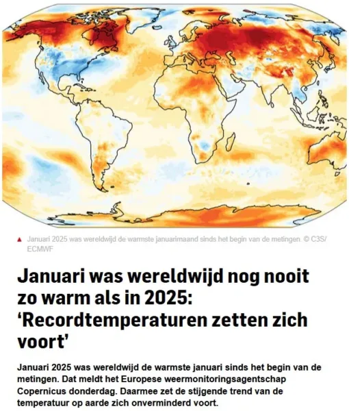 Onlangs werd weer een klimaatrecord gevestigd: januari 2025 zou de warmste januarimaand zijn ooit gemeten. Het AD (figuur 1) doet er zelfs een schepje bovenop en meldt dat de ‘recordtemperaturen’ zich voortzetten.
