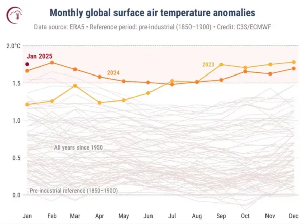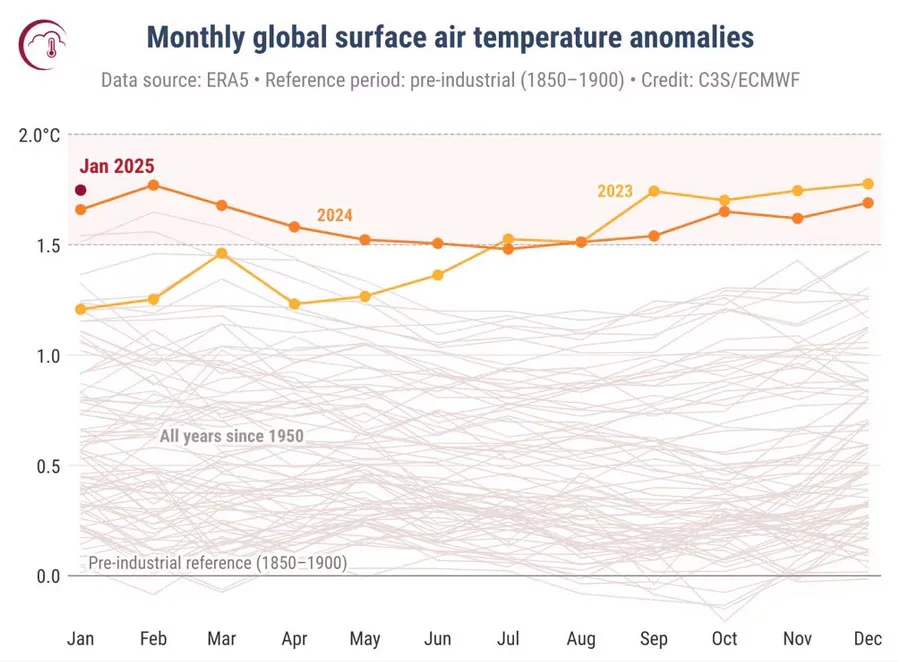 Figuur 2 is ook afkomstig van ECMWF. Er vallen enkele bijzonderheden op. In de eerste plaats is de wereldtemperatuur van januari 2025 al weergegeven op 6 februari 2025, nog geen week na januari. Dat kan alleen maar als men voor die rode punt satellietdata gebruikt heeft. De wereldtemperatuur op basis van thermometermetingen zoals die door bijvoorbeeld CRUDATA worden berekend (Hadcrut5) komen pas later uit en zijn op het moment van schrijven nog niet beschikbaar.