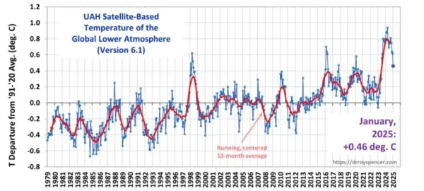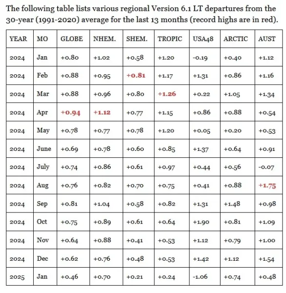 Je zou verwachten dat het verschil tussen de januari 2025 temperatuur en januari 2024 van ECMWF identiek zou zijn aan die van UAH die Roy Spencer op 4 februari publiceerde , maar dat is niet het geval. ECMWF stelt de temperatuur van januari 2025 boven die van 2024, terwijl de UAH temperatuur van januari ruim beneden die van 2024 uitkomt.