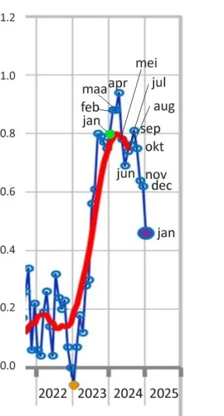 Figuur 4 is een uitvergroting van de 4 meeste recente jaren van de UAH grafiek. Te zien is dat januari 2025 (paars) ruim 0,3 graden koeler was dan januari 2024 (groen). Het bruine bolletje onderaan is januari 2023.