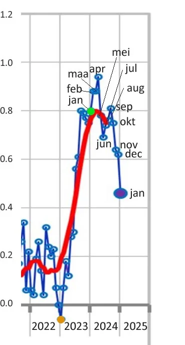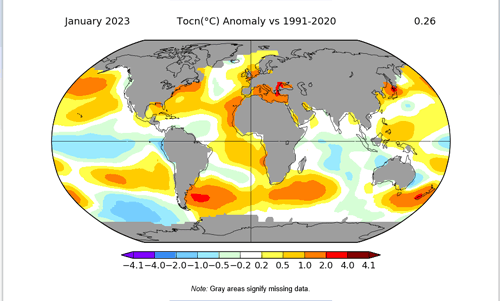 Als afsluiting een animatie van de mondiale SST (Sea Surface Temperature) van januari 2023 t/m december 2024. Op basis van kaartjes gemaakt met GISS Surface Temperature Analysis. De SST per maand is vergeleken met de referentieperiode 1991-2020. De onderliggende data zijn afkomstig van schepen, boeien en ARGO boeien. Let op het ontstaan van de super El Niño en de warme plek in NW van de Pacific. Zodra El Niño afneemt ontstaat er een sterke opwarming van de Atlantische Oceaan.