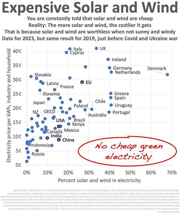Dertien jaar later is Amerika inderdaad rijker en veiliger dan Europa. Wij zijn niet alleen sterk afhankelijk geworden van de import, het energiesysteem dat we zelf zijn gaan bouwen, met een sterke nadruk op elektriciteit afkomstig van zon en wind, is duur en inefficiënt. De ‘groene gekkies’ benadrukken dat de kosten van een zonnepaneel steeds verder gedaald zijn. Wellicht en voor een deel komt dat door de verhuizing van de productie naar China. Maar het gaat niet om de kosten van een paneel, het gaat om de totale kosten van het elektriciteitsnetwerk. En die zijn astronomisch. De bekende Deense milieueconoom Bjorn Lomborg toont geregeld het volgende plaatje dat laat zien dat landen met veel zon en wind altijd hoge elektriciteitsprijzen hebben. Goedkope zon en wind bestaan simpelweg niet.