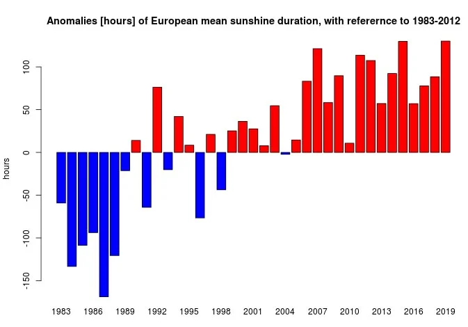 Figuur 9 toont de sterke toename van het aantal zonuren in Europa vergeleken met de referentieperiode 1983-2012.