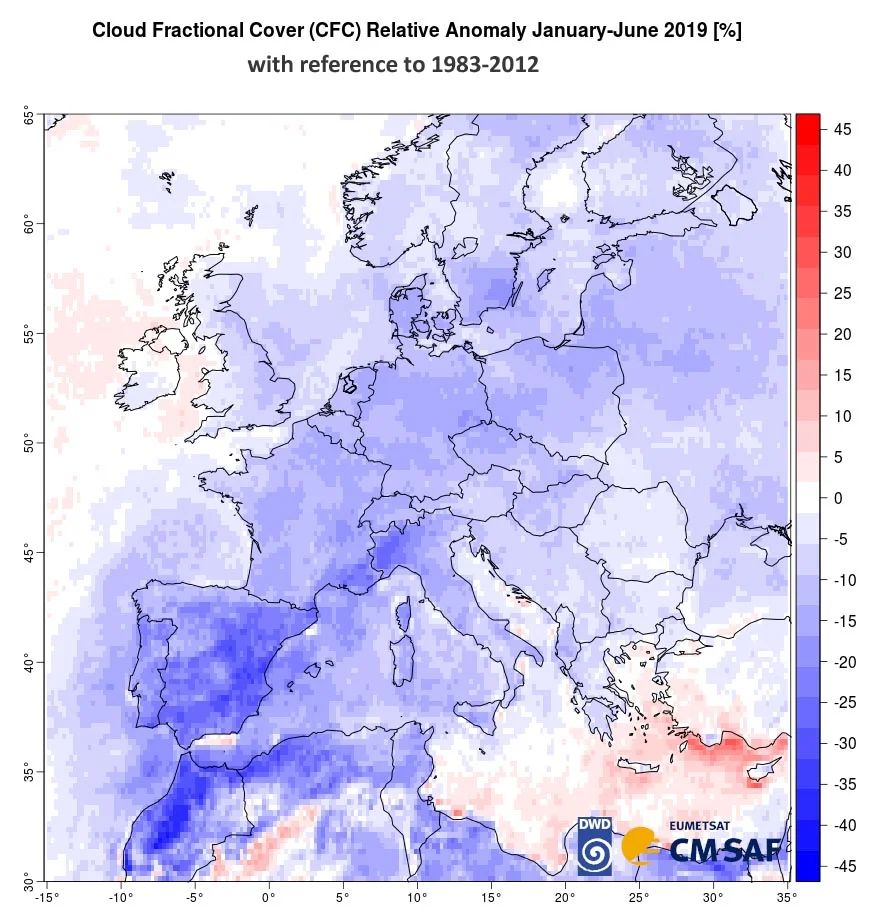 Het kaartje van figuur 10 toont de ruimtelijke spreiding de anomalie van de bewolkingsgraad voor het eerste halfjaar van 2019 ten opzichte van de referentieperiode 1983-2012. De wolkendata is helaas nog niet beschikbaar voor een langere periode, maar gezien de sterke toename van het aantal zonuren in Europa (figuur 9) kan men ervan uitgaan dat dit beeld (in vrijwel geheel Europa een afname van bewolking) kenmerkend is voor de afgelopen 4 decennia.