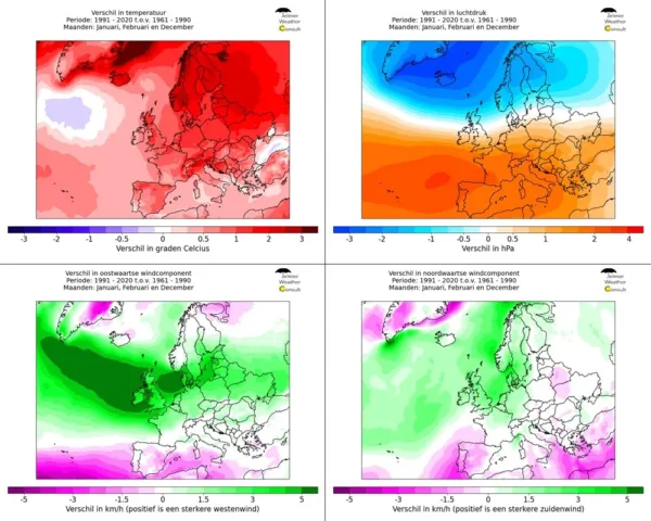 En hoe zit het met veranderingen in de luchtcirculatie voor Europa? Vorig jaar wierp een jonge weerman daar licht op, door voor een discussie op de website ‘Weerwoord’ een viertal interessante kaartjes te maken waarop de winters in de klimatologische periode 1991-2000 worden vergeleken met die van 1961-1990.