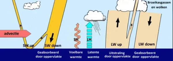 Maar straling is niet de enige factor die de temperatuur op een bepaalde plek bepaalt. Figuur 3 is de ‘surface’ zijde van de bekende energiebalans van Trenberth et al. De getallen in de originele figuur zijn gemiddelde energiewaarden in de energiebalans van de gehele aarde. Voor de oppervlakte energiebalans van een willekeurige plaats gelden die uiteraard niet, daarom zijn ze in figuur 3 weggelaten. In plaats daarvan heb ik advectie toegevoegd. Advectie is de aanvoer van warmte of kou van elders. Iedereen die het weer een beetje bijhoudt weet dat vanwege de relatieve ligging van Nederland die advectie van grote betekenis is. Als de wind verandert, of beter gezegd als het brongebied van de binnenstromende luchtmassa verandert, heeft dat vaak grote gevolgen voor de temperatuur en andere weersfactoren.
