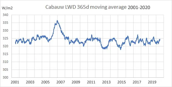 Volgens NOAA betekent dat een stijging van de stralingsforcering van CO2 met 0,577 W/m2. In de grafiek van figuur 6 heb ik de seizoensfluctuaties in de LWD van Cabauw verwijderd door het toepassen van een 365 daags moving average. De variantie is waarschijnlijk vooral het gevolg van variantie in bewolking. De trend is lichtelijk negatief, vooral het gevolg van de piek in 2006-2007. De theoretische toename van de stralingsforcering van CO2 met 0,577 W/m2 is te klein om zichtbaar te zijn in het volatiele signaal.