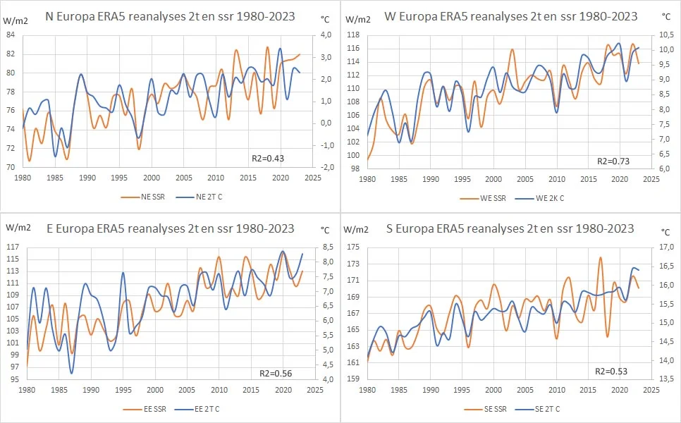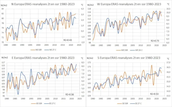 Voor de grafieken in figuur 7 maakte ik gebruik van de ERA5 reanalyses datasets vanaf 1979 t/m 2023 zoals die beschikbaar zijn in de Climate Explorer van het KNMI. De gebruikte parameters zijn ssr (surface net solar radiation) en 2t (temperatuur op 2m hoogte). De resultaten laten weinig aan de verbeelding over: in Europa als geheel is ook sprake van een opvallend grote temperatuurstijging en tegelijkertijd een opvallend grote toename van de netto instraling.