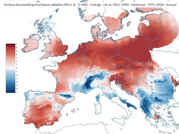 Figuur 8 vergelijkt de geobserveerde SW instraling aan het aardoppervlak van 1991-2000 met die van de periode 1961-1990. Het beeld is duidelijk: in grote delen van Europa is er sprake van een forse toename van de invallende zonne-energie. Net zoals dat in Nederland het geval was zijn ook hier afname van aerosolen maar vooral afname van bewolking een belangrijke oorzaak: