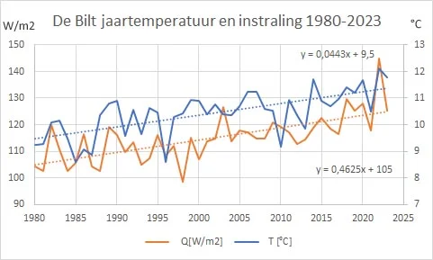 Mijn conclusie was in dat artikel dat de sterke opwarming in Nederland sinds 1980 voor een aanzienlijk deel te verklaren is uit een sterke toename van de hoeveelheid invallend zonlicht (globale straling Q). Terwijl de jaartemperatuur in De Bilt vanaf 1980 t/m 2023 toenam met maar liefst 1,95 °C, nam de hoeveelheid invallende zonne-energie van 105 W/m2 toe tot een ongelofelijke waarde van 125 W/m2. Dat is 20,35 W/m2 meer dan aan het begin van deze 44 jarige periode!