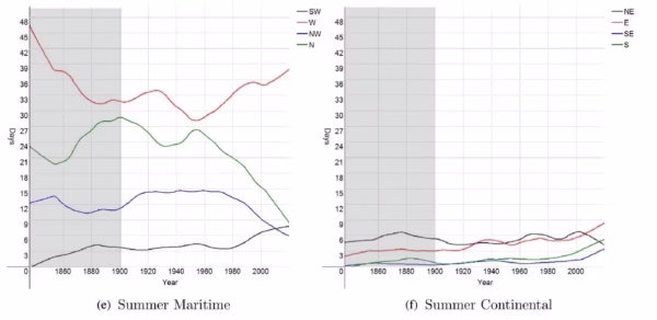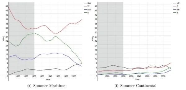 Dat laatste is goed te zien op het kaartje linksonder, waarbij de groene kleuren een sterkere westenwind suggereren. Het kaartje toont tenslotte dat de afgelopen decennia is er ’s winters sprake was van een sterkere aanvoer van lucht uit het zuiden. Wat dat betekent voor de temperatuur hoef ik denk ik niet uit te leggen. Ik heb Jelmer gevraagd of hij ook voor de andere seizoenen dergelijke kaartjes heeft, maar hij heeft helaas nog niet geantwoord.