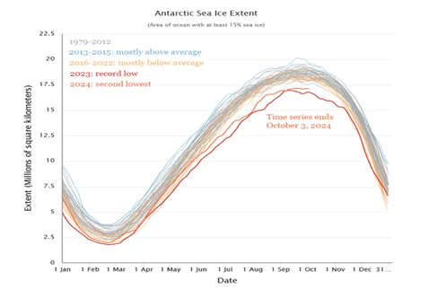De rode lijn van 2023 loopt na 31 december door als de oranje lijn van 2024 op 1 januari. Het drijfijsminimum was die Antarctische zomer niet bijzonder laag, en het ijs in de winter van 2024 in bijna volle omvang teruggekomen. Niks kantelpunt in het klimaat: het zeeijsmaximum kantelt na het laagterecord van 2023 gewoon weer terug naar min of meer normaal.