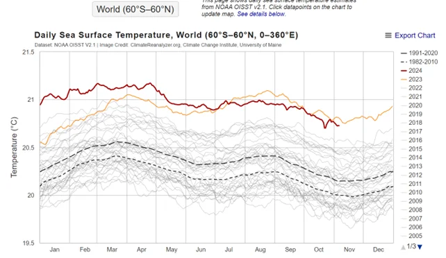 Misschien herinnert u zich de hyperventilerende opwinding nog, maar is het vervolg u ook bijgebleven? In april begon de SST te dalen, ook deze sigma’s smolten weg als sneeuw voor de zon, en inmiddels is de SST lager dan in 2023 om dezelfde tijd van het jaar. Nog steeds wel aan de hoge kant vergeleken met de afgelopen veertig jaar, maar dat is niet meer dan logisch in een opwarmend klimaat.